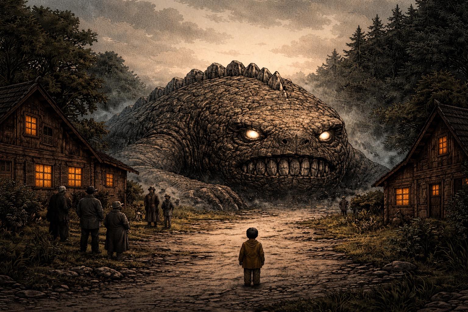 Het monster lag aan de rand van het land en niemand kon zich precies herinneren wanneer het was gekomen. Men wist alleen dat het eerst rust had gebracht, omdat het beloofde te waken terwijl de mensen sliepen. Het was groot en zwaar en nam ruimte in zonder te vragen. Wie er langs wilde, moest zich aanpassen, een bocht maken, zachter lopen, minder zichtbaar worden.